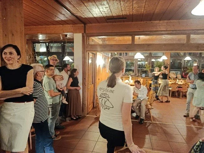 Mentorom, Sipos Mónika invitálására érkeztem meg a fergeteges táncházi hangulatba, melynek helyszínéül egy görög étterem szolgált. A talpalávalót itt is a Magyarországról érkező Lelkes Együttes biztosította. A Regös Néptáncegyüttes munkáját segítette az ingolstadti Tulipán gyermektánccsoport.